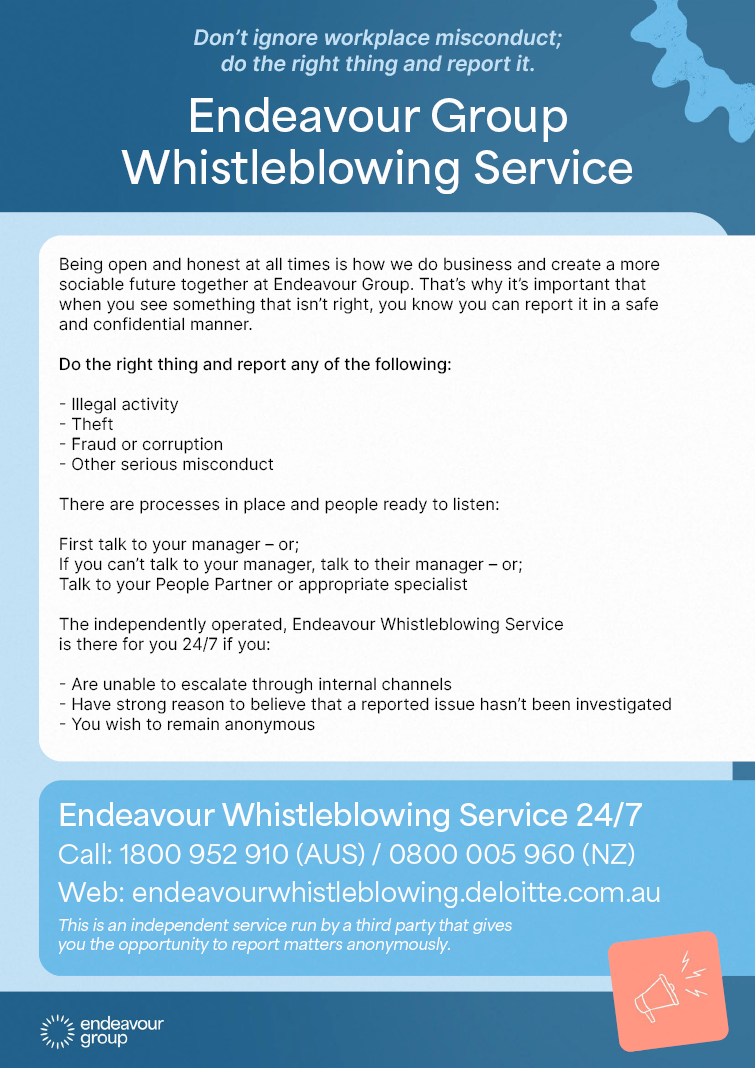 Please find the Endeavour Group Whistleblowing Policy here